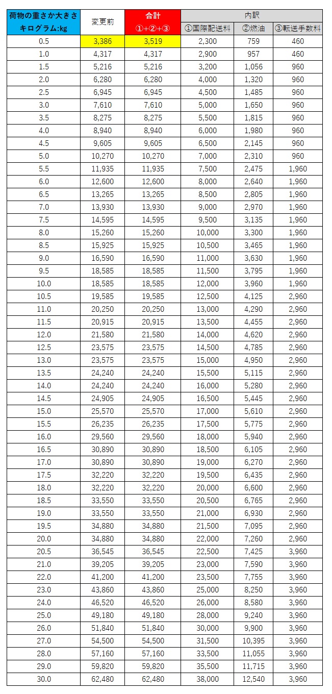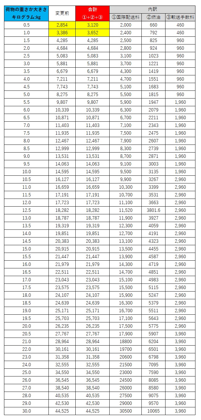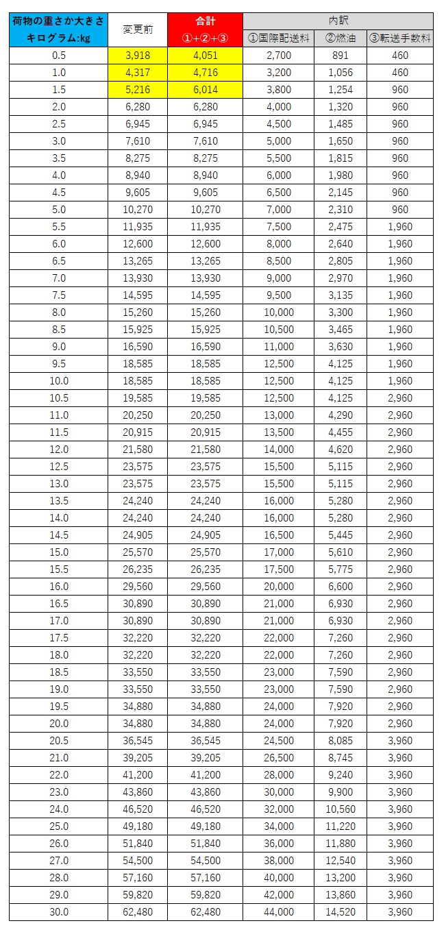 今回の料金改定はFedexで発送しているNORTH AMERICA,CENTRAL AMERICA・北米南米エリア、