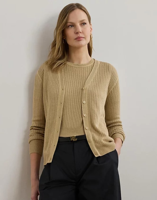 Lauren Ralph Lauren Womens Rib-Knit Linen-Blend V-Neck Cardigan