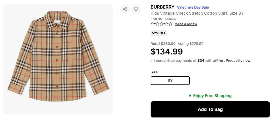 5조마샵) 발렌타인데이 최대 75% 세일! 버버리 키즈 빈티지 체크 셔츠 $134.99