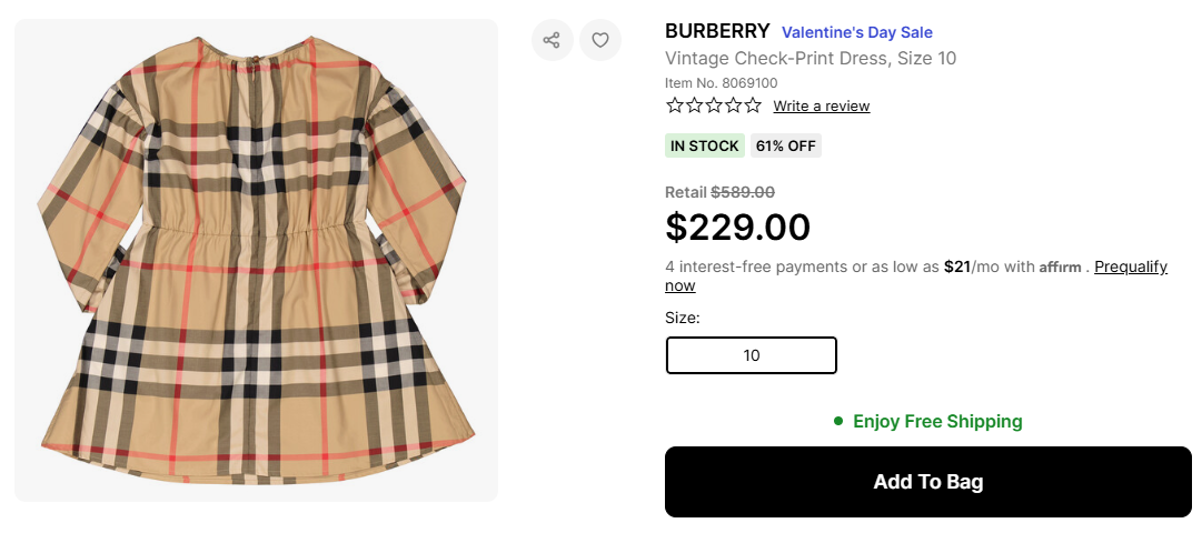 버버리 빈티지 체크 프린트 드레스 10Y