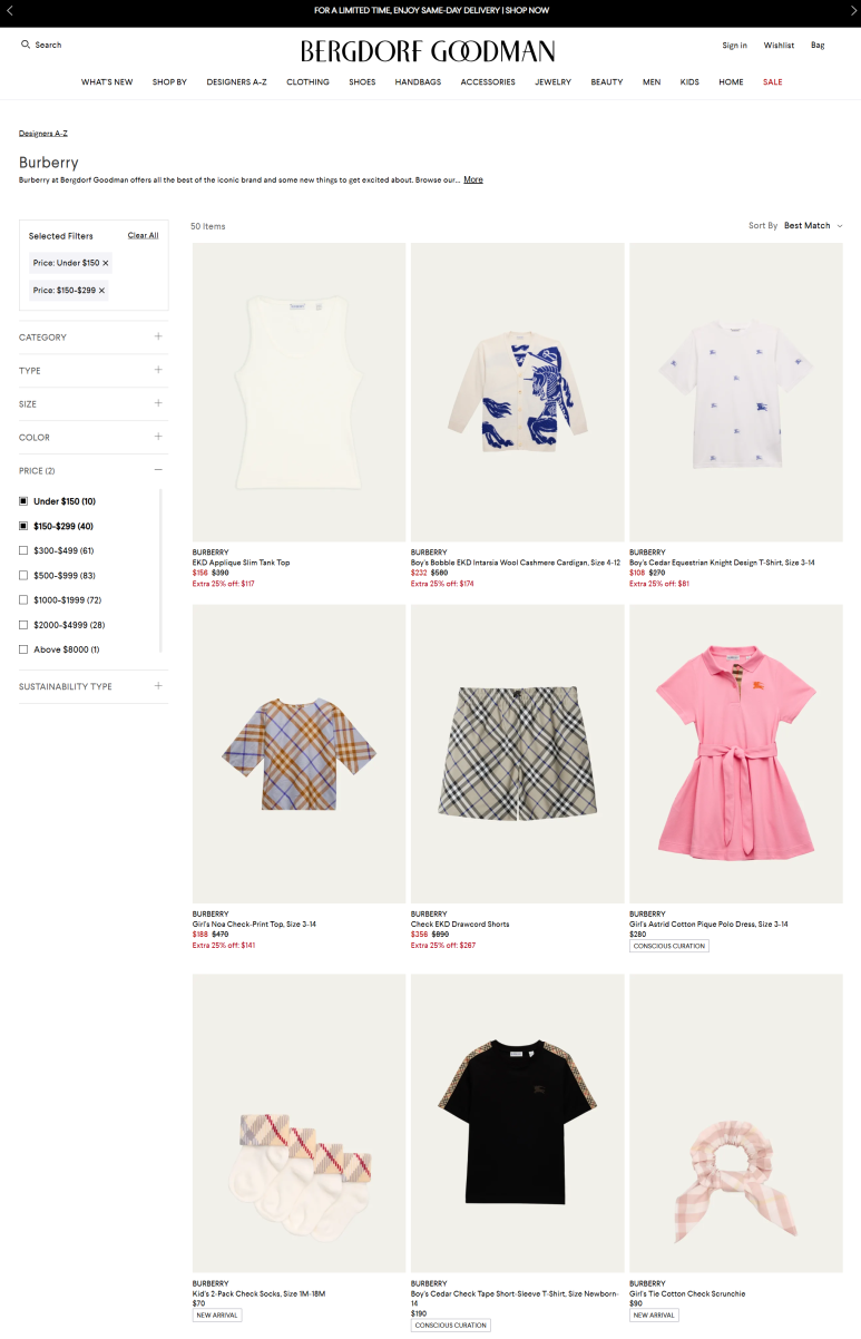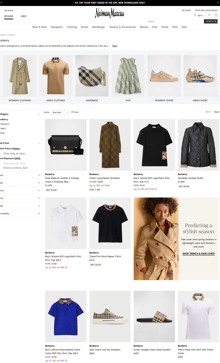 미국의 고급 백화점 체인으로, 1907년부터 시작된 명품 중심 럭셔리 백화점이에요. 오랜 역사와 함께 샤넬, 루이비통, 디올, 버버리 등 하이엔드 브랜드를 공식 취급합니다. 제품 정품 보장, 프리미엄 쇼핑 경험, 그리고 계절 세일 시점의 득템 찬스로 해외 직구족들에게 꾸준한 인기가 있답니다. 버버리 제품 중 세일 상품만 선택해 보시면, 시즌오프 시기 또는 특가 이벤트 기간에만 열리는 버버리 세일 아이템들을 직구 하실 수 있어요.