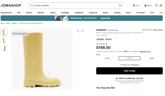 조마샵은 미국 기반의 병행수입 전문 쇼핑몰로, 시계 , 선글라스 패션, 잡화 향수 등을 중심으로 명품을 정가 대비 최대 30~70% 할인된 가격에 직구할 수 있는 해외 사이트에요. 버버리 역시 조마샵을 통해 직구 하시면, 최대 70% 할인된 핫한 가격으로 구매하실 수 있답니다. 정품이 보장되기 때문에 가품 걱정 없이 최저가로 버버리 직구가 가능한 곳이에요. 특히 우먼, 키즈 카테고리를 살펴보시면, 정말 숨은 보석 같은 버버리 아이템들을 만나보실 수 있을 거에요 . 조마샵 직구 시 배대지는 몰테일 DE 센터 선택하셔야 Tax free로 받아 보실 수 있어요.