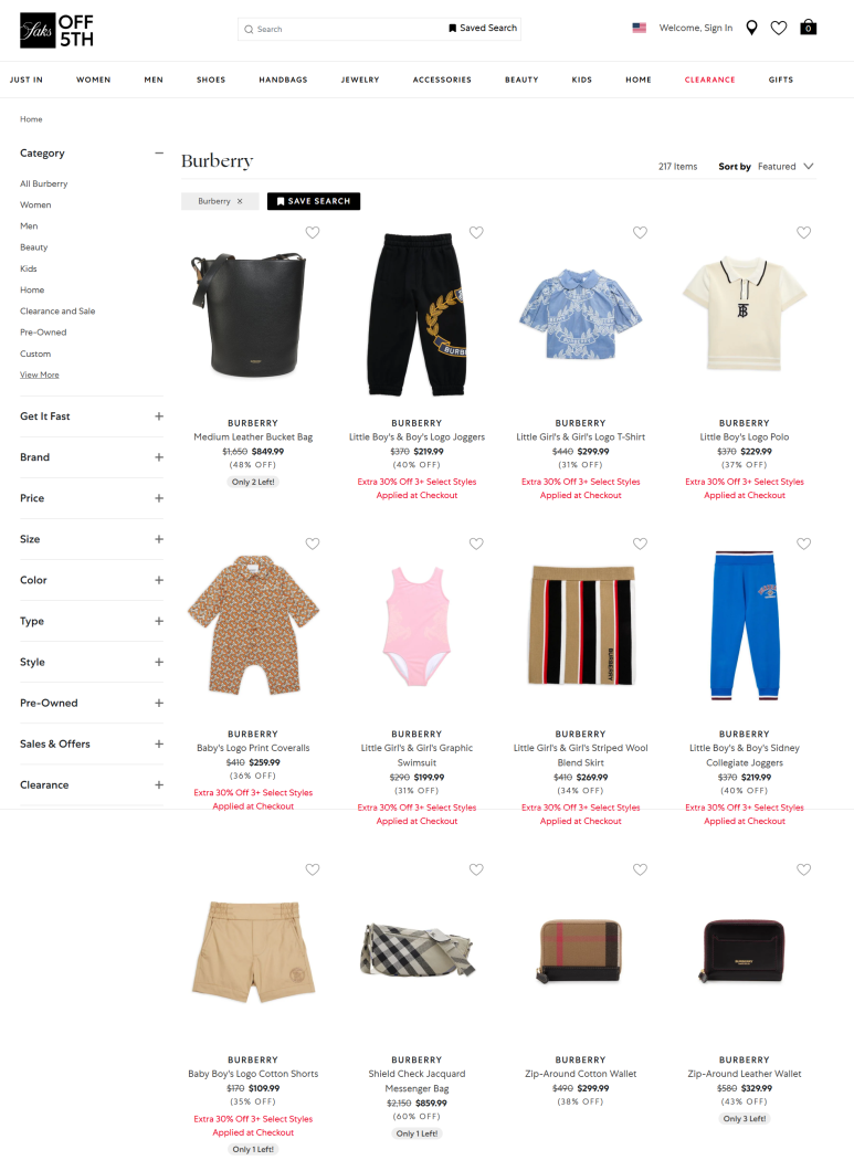 삭스 오프 피프스는 미국의 대표적인 프리미엄 아울렛 쇼핑몰이에요. 고급 백화점 Fifth Avenue의 아울렛 버전으로, 명품 브랜드 제품을 최대 70% 할인된 가격에 판매하고 있답니다. 오프라인 매장도 있지만, 온라인 직구족들 사이에서 숨은 버버리 명품 핫딜 쇼핑몰로 유명해요.