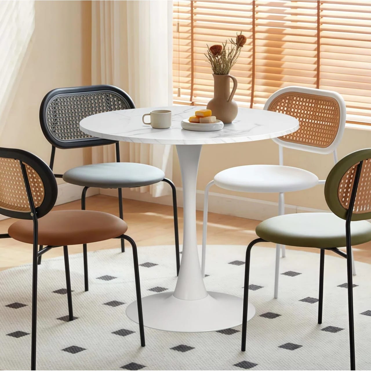 Beachcrest Home 19.5″ Seat Height Boucle Rattan Back Dining Chair (Set of 4) 는 라탄과 부클 소재 조합이 갖는 텍스처 대비가 특징으로 미니멀한 인테리어를 연출해 주는 테이블 가구에요. 우드톤이나 내추럴 홈 스타일, 스칸디나비안 스타일, 또는 라탄, 내추럴 소재가 트렌디한 보헤미안 또는 코지 인테리어에도 어울려요. 지금 웨이페어에서 세일가로 직구 가능합니다. 몰테일 뉴저지/델러웨어 센터를 이용하시면 안전하게 가구 직구 하실 수 있어요.