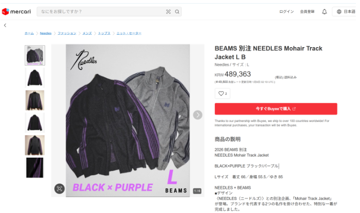 스포티한 감성과 브랜드 아이덴티티가 확실히 표현되어 있으며, 컬러웨이는 브라운, 블랙, 그레이처럼 세련되고 활용도 높은 색상으로 출시되었답니다. 이번 니들스 × 빔즈 모헤어 트랙 자켓은 1월 2일 일부 빔즈 오프라인 스토어와 온라인 스토어를 통해 한정 발매되었으며, 현재는 빠르게 품절되며 높은 관심을 받고 있어요. 일본에서만 만나볼 수 있는 익스클루시브 아이템이라는 점 역시 패션 마니아들의 소장 욕구를 자극하는 요소에요. 현재 메루카리를 통해서 직구 하실 수 있답니다.