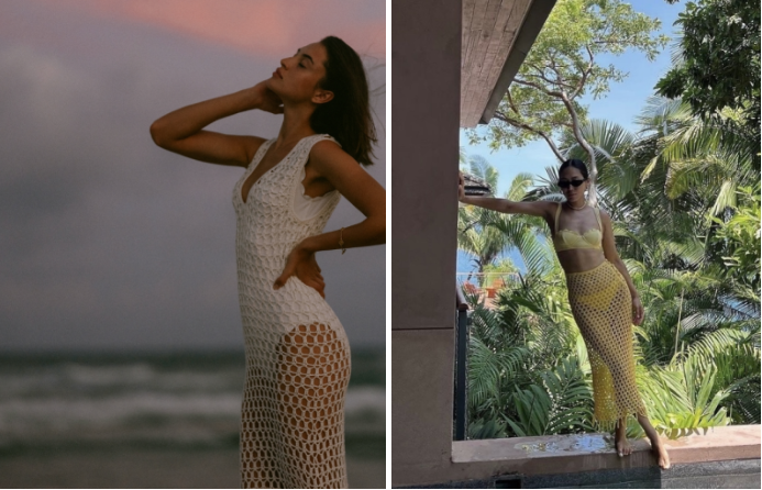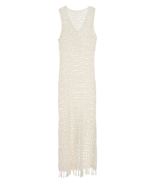 Crochet Sleeveless Dress는 수영복 위에 가볍게 걸치는 커버업(Cover-up)이자, 단독으로도 충분히 매력적인 럭셔리 리조트 웨어입니다. 특히 내추럴 컬러는 가공되지 않은 듯한 따뜻한 아이보리 톤으로, 휴양지의 여유로운 분위기를 극대화해 줍니다. 비키니나 원피스 수영복 위에 툭 걸치면 호텔 조식을 먹으러 가거나 해변 산책을 할 때 완벽한 룩이 완성됩니다. 라피아 소재의 햇 이나 토트백과 매치해도 좋아요.