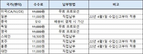 | 제목 | [공지] 국가별/센터별 사업자 통관수수료 안내 | 등록일 | 2022-03-16 |