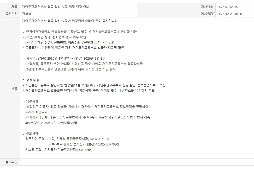 | 제목 | [공지] 관세청 개인통관고유부호 검증 강화 안내 (26.02.02~) - 2025.12.29 업데이트 | 등록일 | 2025-12-02 |