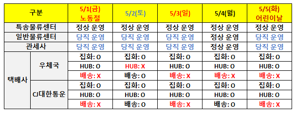 다가오는 5월 연휴 기간(근로자의 날 및 어린이날) 동안의 국내 물류 및 배송 운영 일정을 안내해 드리오니, 서비스 이용 및 수령 일정에 참고해 주시기 바랍니다.
