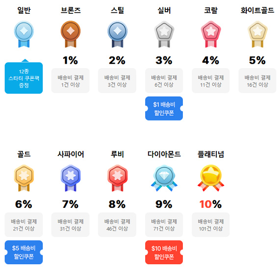 5. 유의사항 몰테일 배송비 할인은 등급할인+쿠폰할인 합계 최대 15% 입니다. 미사용 직구페이는 5월 29일 소멸됩니다. 타 서비스 이용 실적은 몰테일 이용 실적이 합산되지 않으며, 타 서비스 실적으로 대체 반영됩니다. (타사 이용 실적 13건 + 몰테일 이용 실적 2건 = 몰테일 이용 실적 13건) 등급 이전 시 몰테일 승급 쿠폰은 발행되지 않습니다. 여러 개의 타 서비스의 이용 실적을 합산하여 신청할 수 없으며, 단일 서비스 실적만 인정됩니다. 본 프로모션은 당사의 사정에 의해 조기 종료 또는 내용이 변경될 수 있습니다.